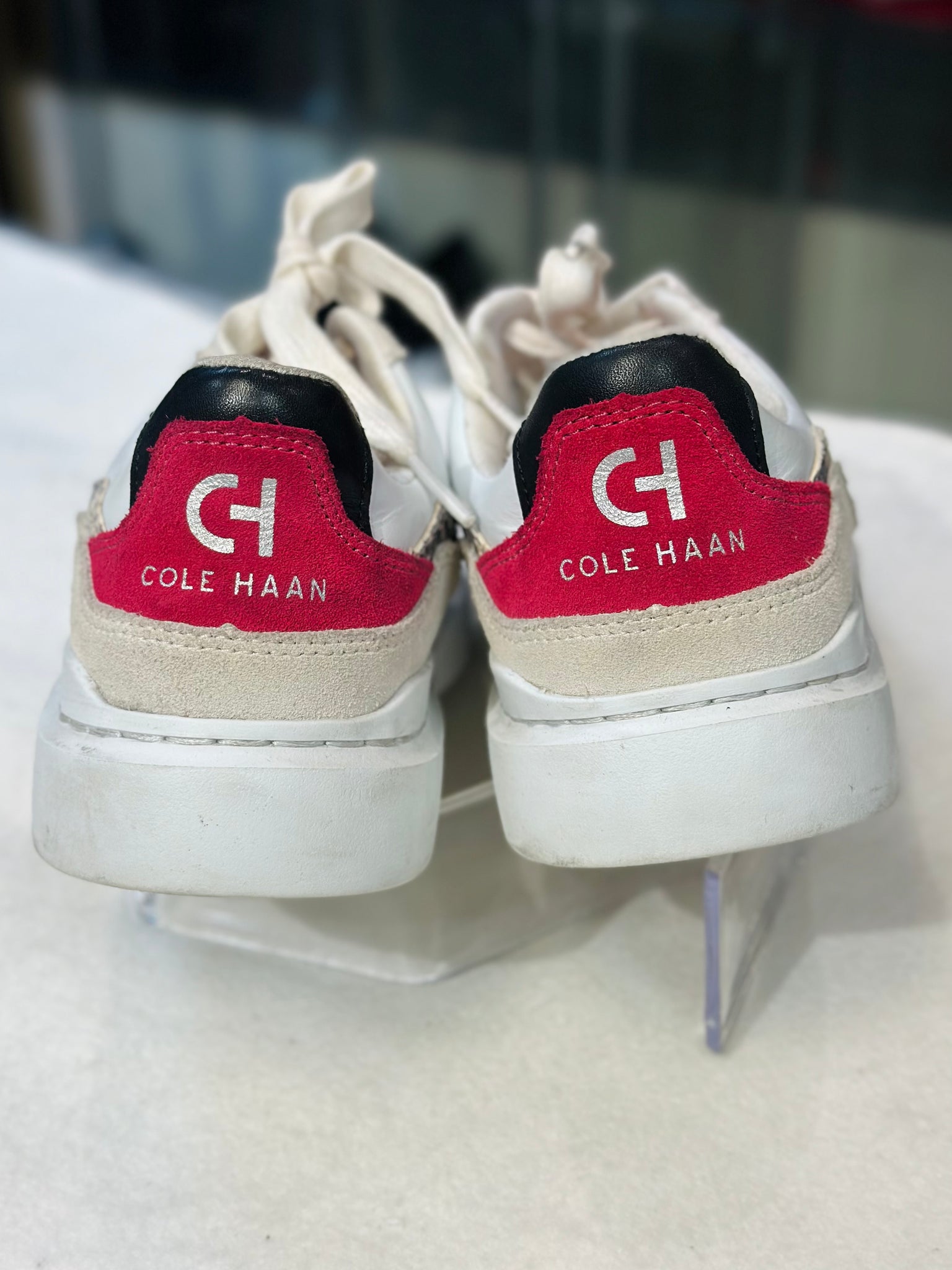 These Cole Haan sneakers feature a cream and white design with a striking red interior, perfect for size 8B women. They have been gently used and maintained in excellent condition.