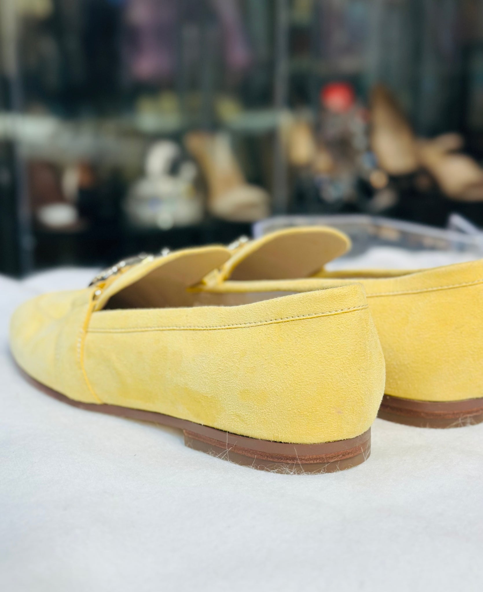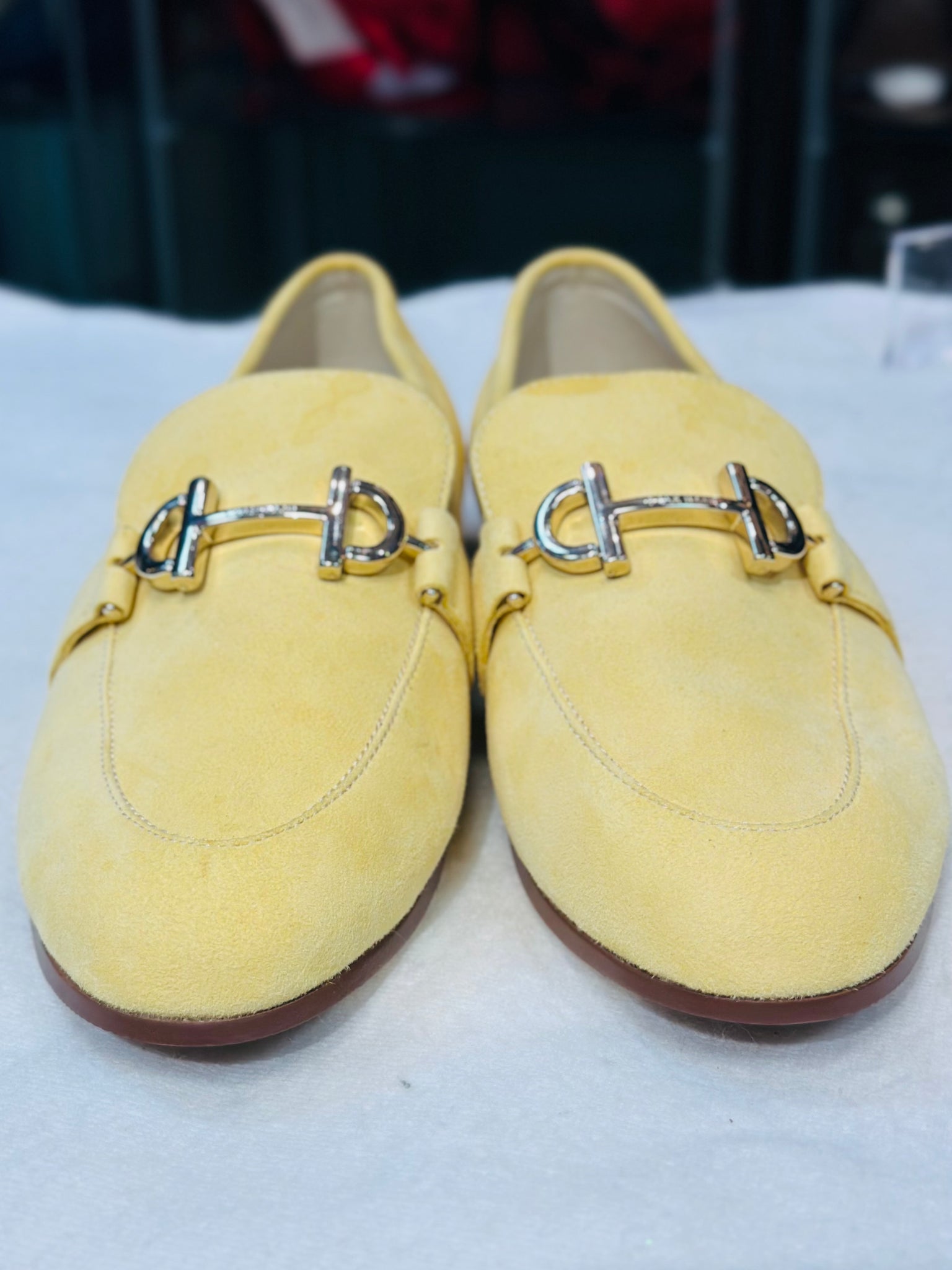 Elegant yellow suede loafers with distinctive silver hardware. Ideal for a sophisticated style. Size 7 ( Never used)