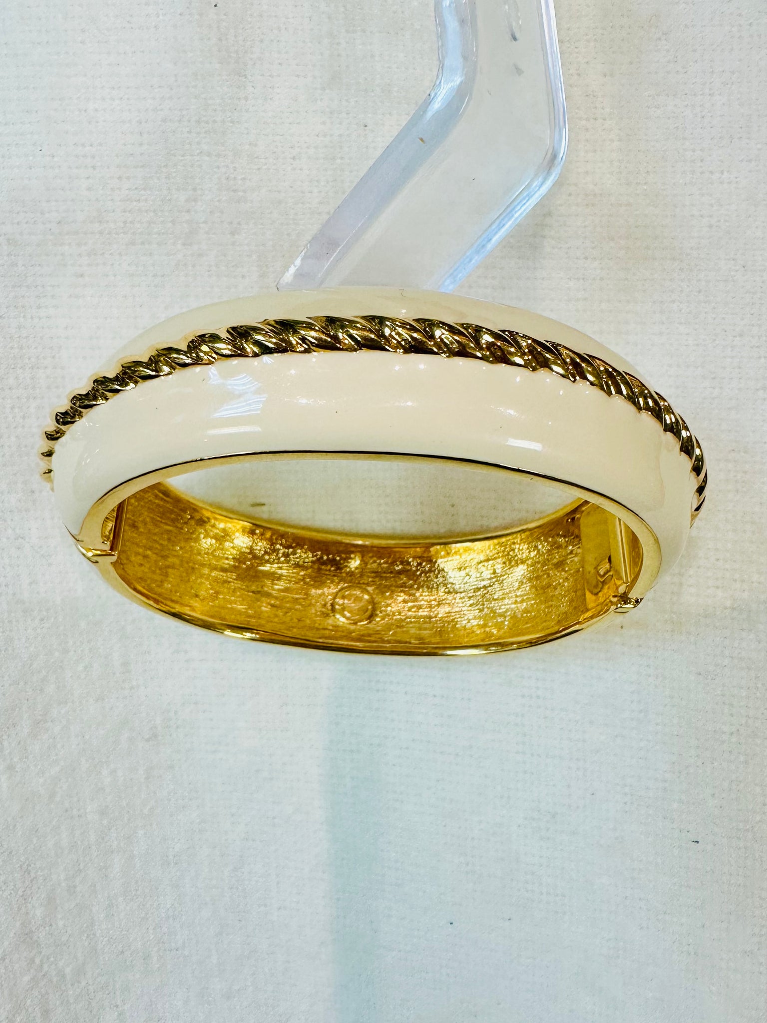 ELEGANT ST. JOHN GLOSSY CREAM ENAMEL GOLD-TONE ROPE DESIGN CUFF HINGED BRACELET (preowned)