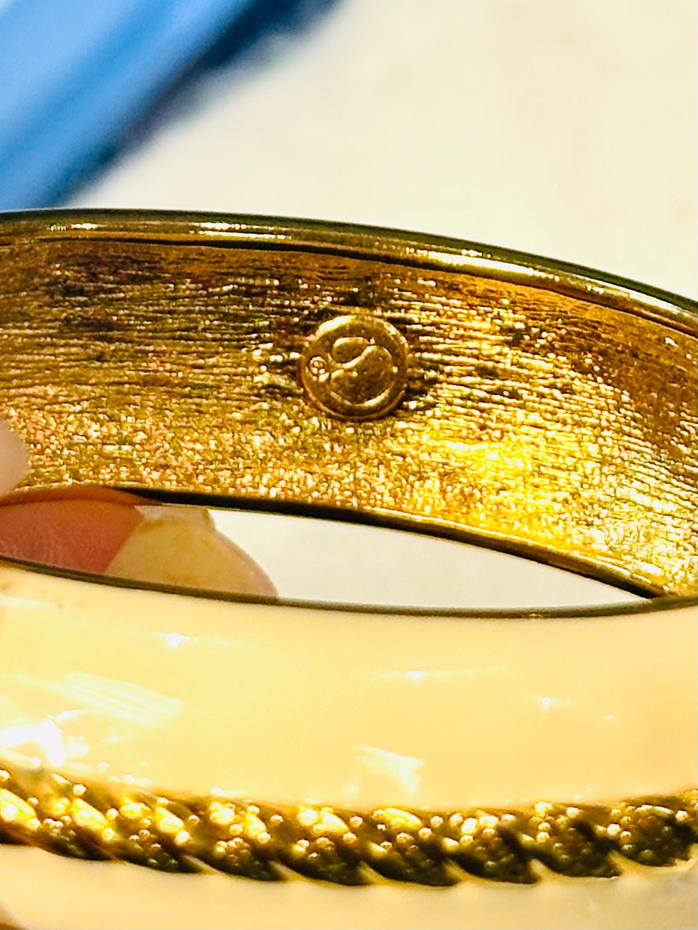 experience timeless elegance with this preowned ELEGANT ST. JOHN GLOSSY CREAM ENAMEL GOLD-TONE ROPE DESIGN CUFF HINGED BRACELET. The glossy cream enamel and intricate rope design add a touch of sophistication to any outfit. The hinged cuff design ensures a comfortable and secure fit. A classic piece for any jewelry collection.