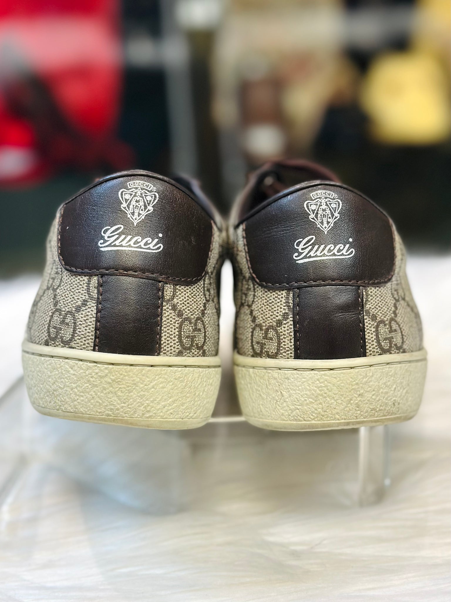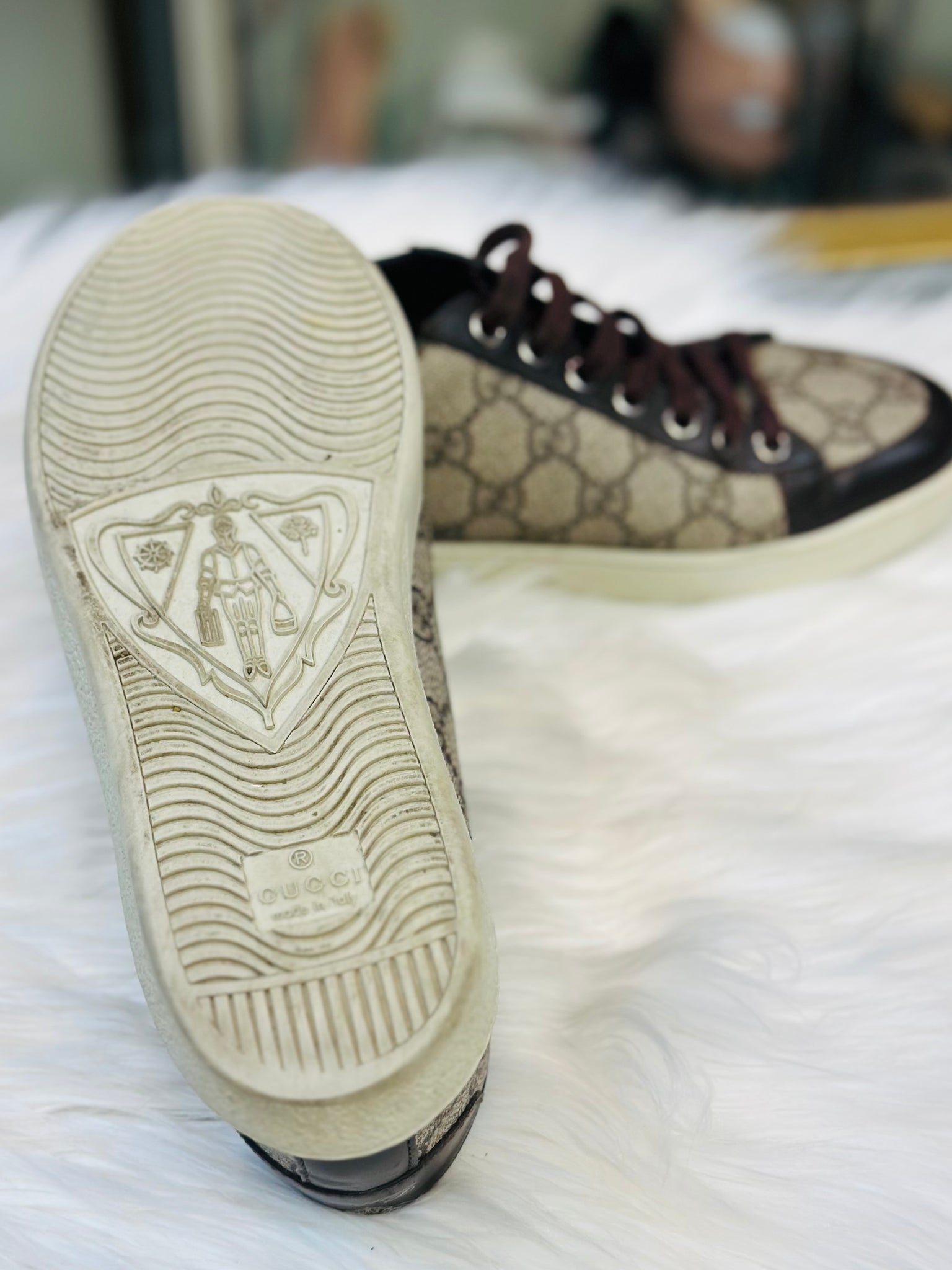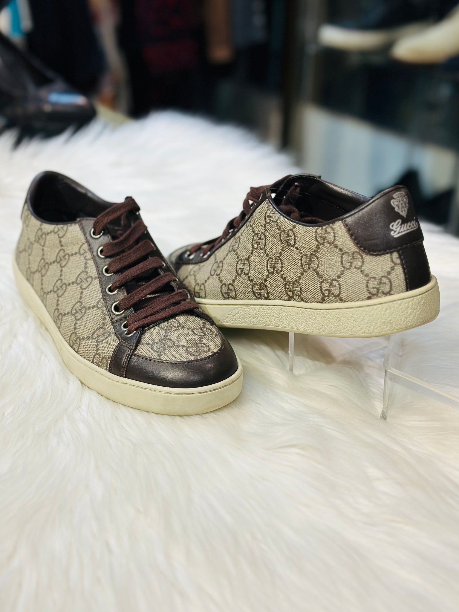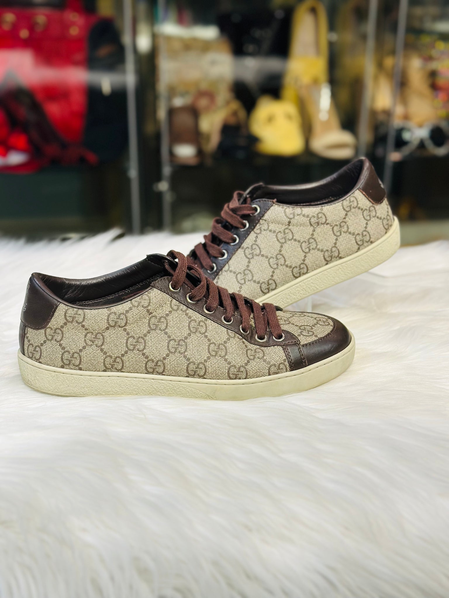 Gucci GG Monogram Canvas Brown and Beige Sneakers size 36.5 Elevate your look with these Gucci sneakers. Stylish brown and beige design. Ideal for casual wear.