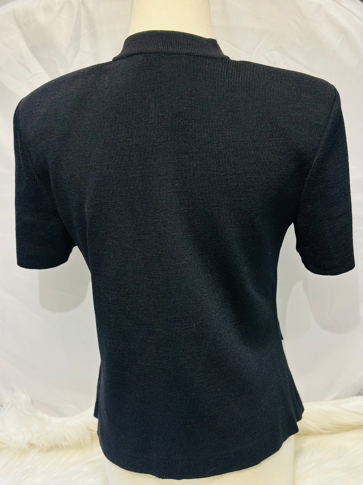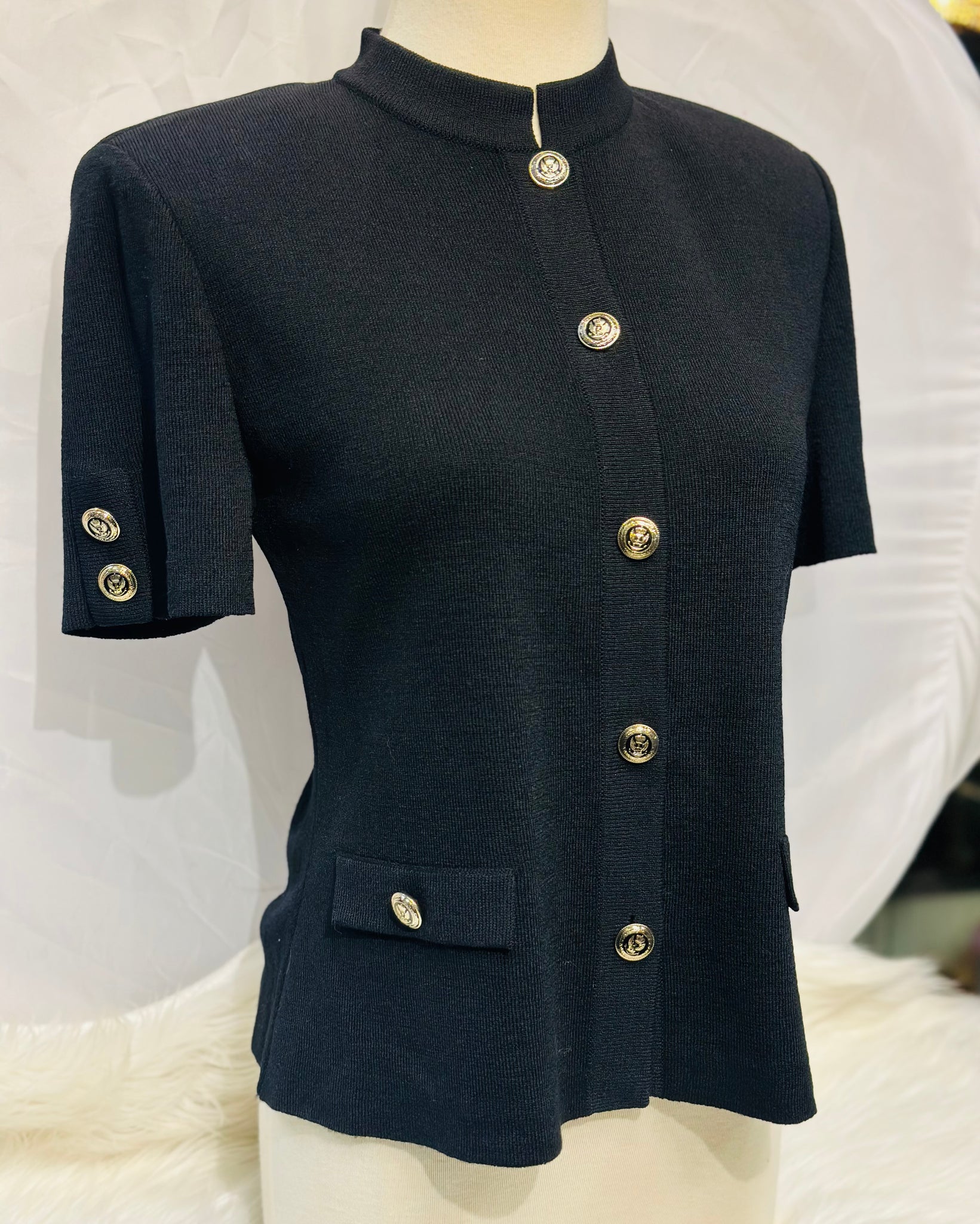 Chic black blazer with short sleeves. Features elegant button accents. Perfect for a polished look.