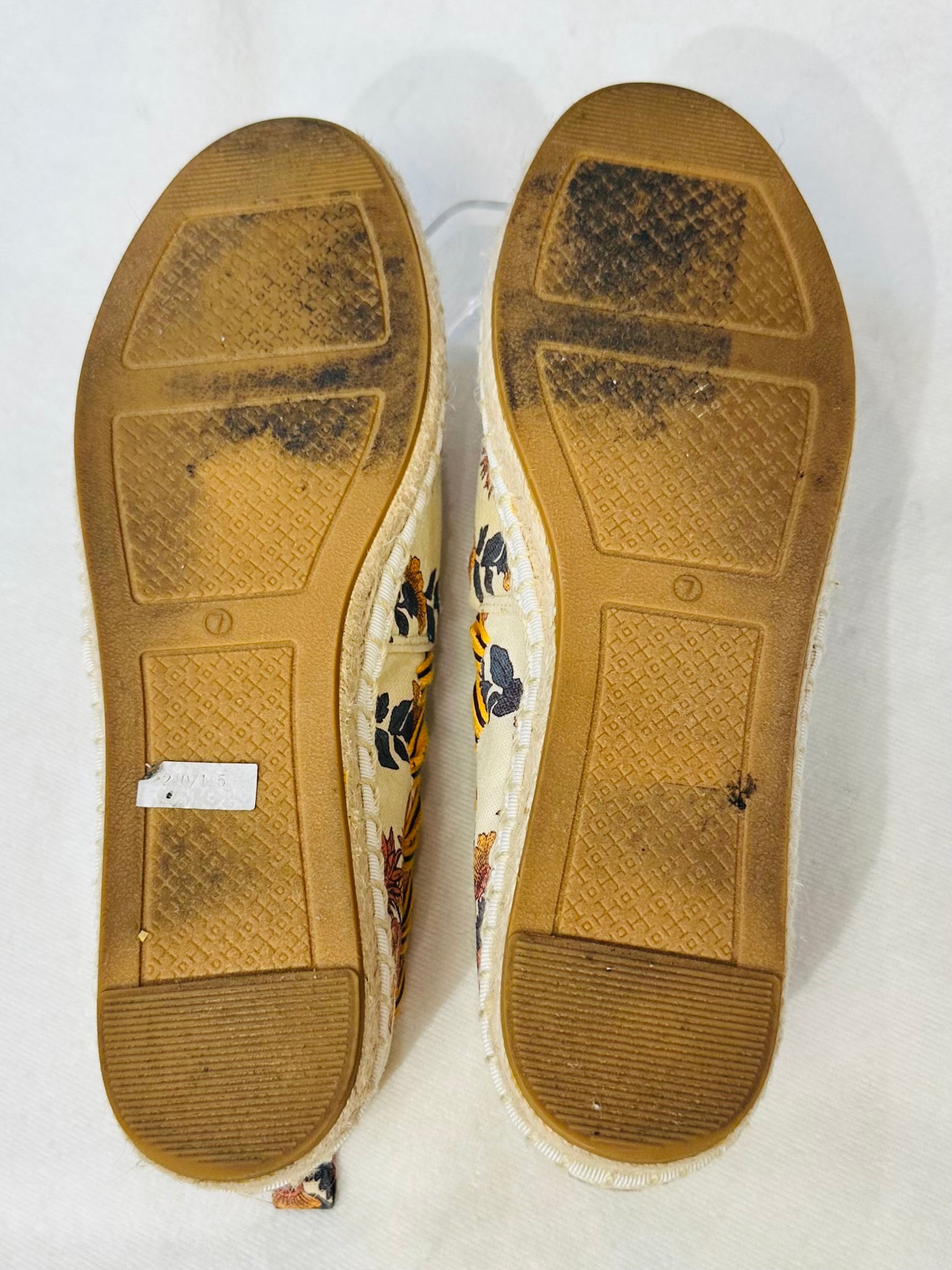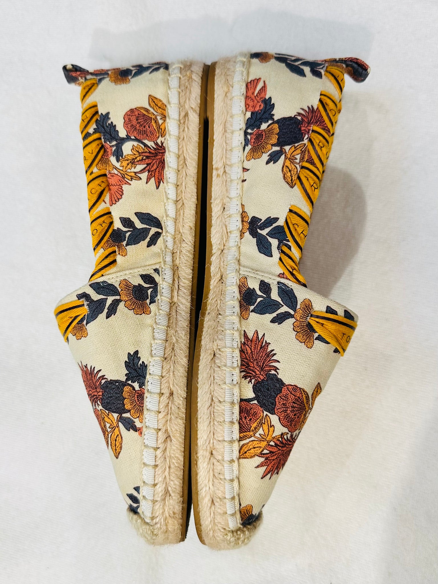 Chic espadrilles with floral pattern. Features beige, orange, and navy hues. (Pre-loved)